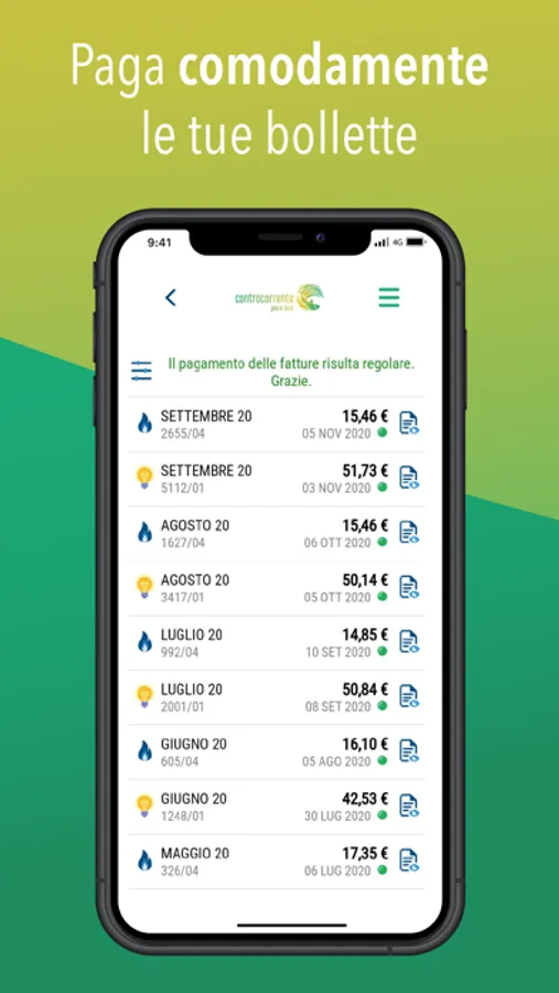 Entra nella sezione Fatture per visualizzare l’archivio delle tue bollette, conoscere il loro stato e pagare quelle in scadenza tramite Carta di Credito o bonifico MyBank.