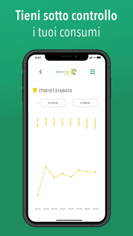 Clicca sulla voce Consumi, scegli il periodo di riferimento e monitora l’andamento e il dettaglio dei tuoi consumi.