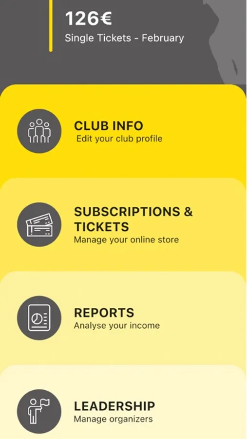 - In-App-Payment System for clubs to sell Single Tickets, Subscriptions and merchandize (+post venta reporting)