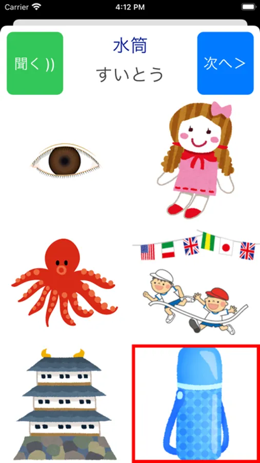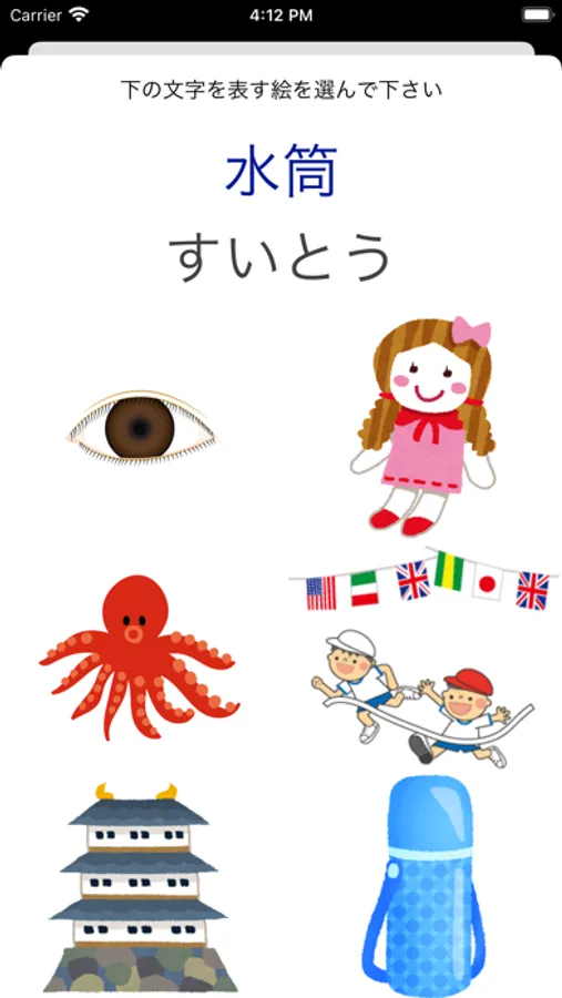 表示された文字単語(漢字またはかな)を表す絵を選ぶと、正誤が表示されます。誤答の時は正答が表示されるとともに、音声でもその単語を聞くことができます。