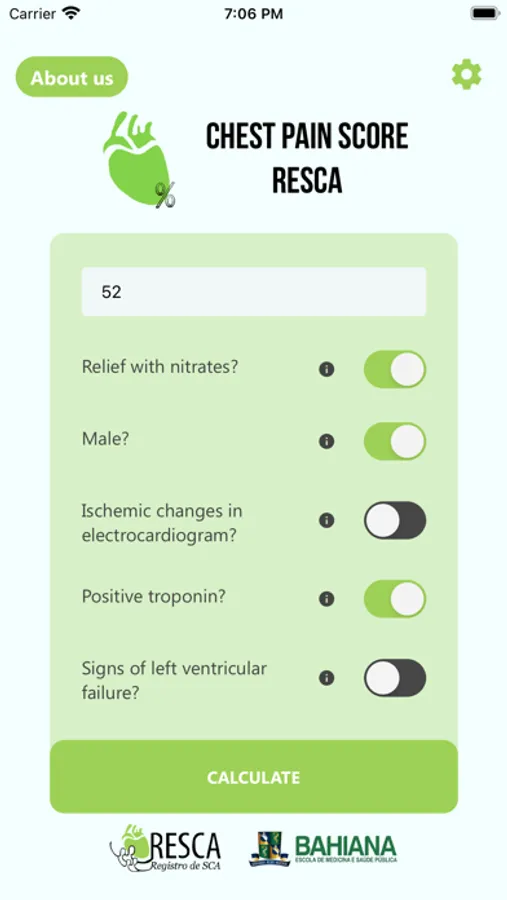 This App was designed to allow the physician to use a few patient's information to quickly calculate a diagnosis probability, which is a very important feature for the emergency department. Furthermore, it is still possible to switch the language to English or Portuguese, making the app accessible to several countries.