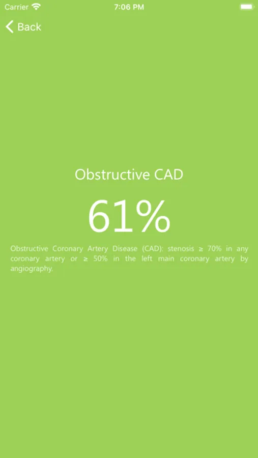 Thus, this App is a tool that applies statistics to predict obstructive coronary artery disease, being a facilitator for treatment and diagnosis in healthcare. It should not be used as a single diagnostic method since each clinical patient has their own individuality. We do not take any responsibility for the improper use of this App.