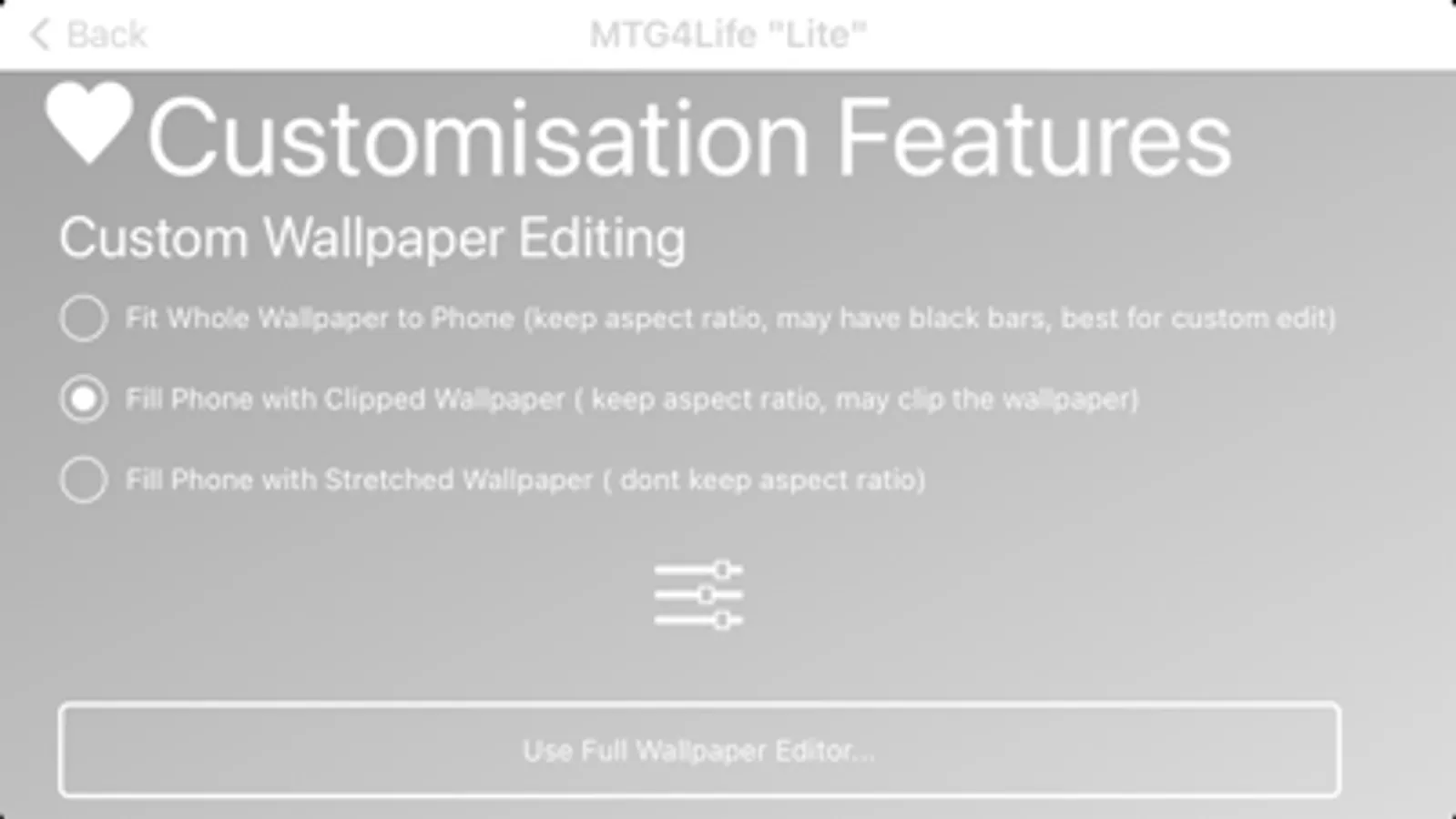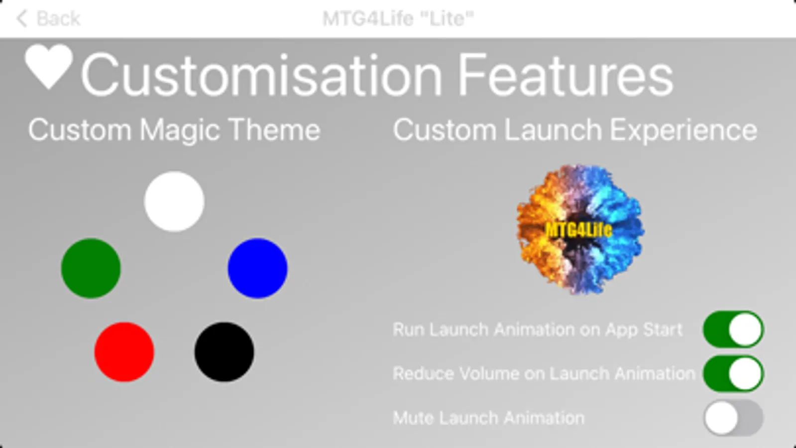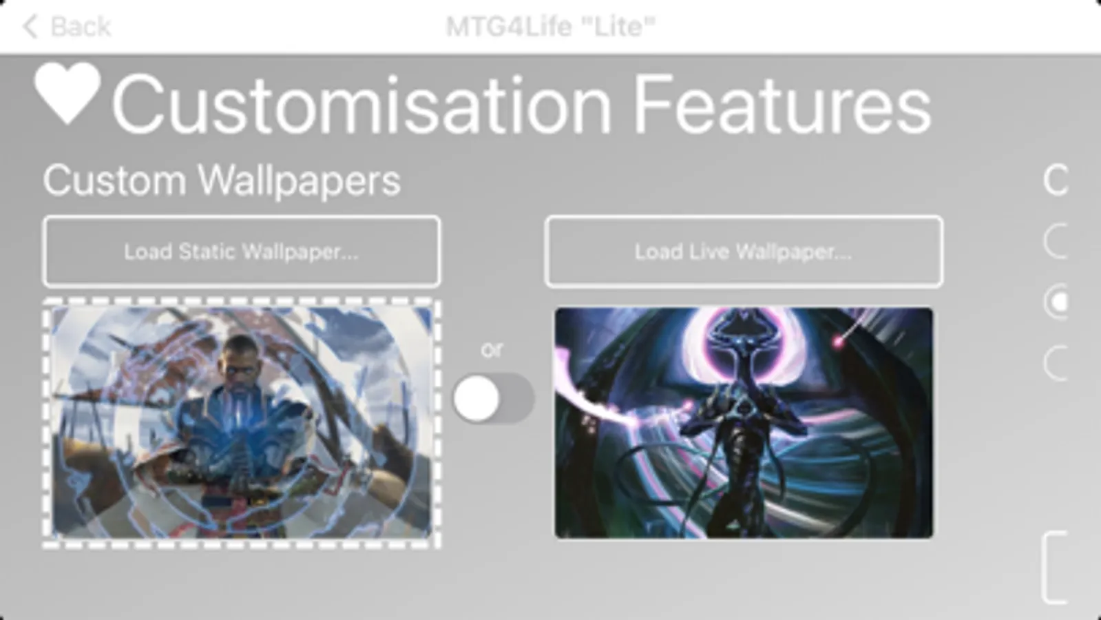 These features are built on top of the the originals core feature of displaying game state integrated into full bleed Magic art; including life counting, secondary counters for poison/energy and player names. The whole app is reskinnable to be any of the five magic colours themes and any art can be downloaded from the integrated MTG4Life website or from anywhere on the web.