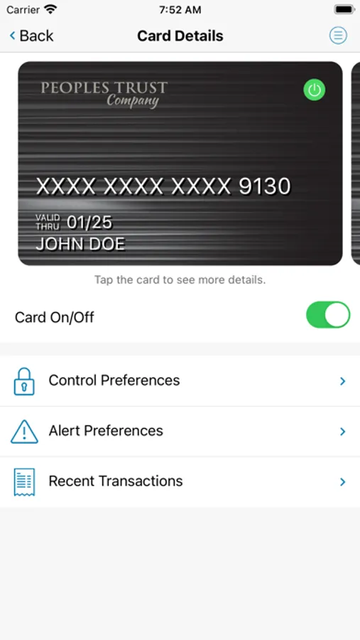 Peoples Trust Company Cards protects your debit cards by sending transaction alerts and enabling you to define when, where and how your cards are used. Download to your smartphone, then set your preferences to monitor and manage your cards.
