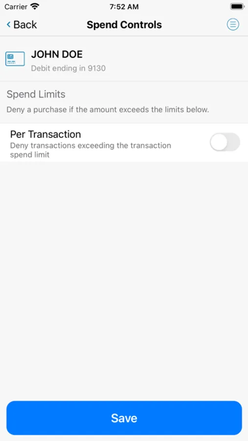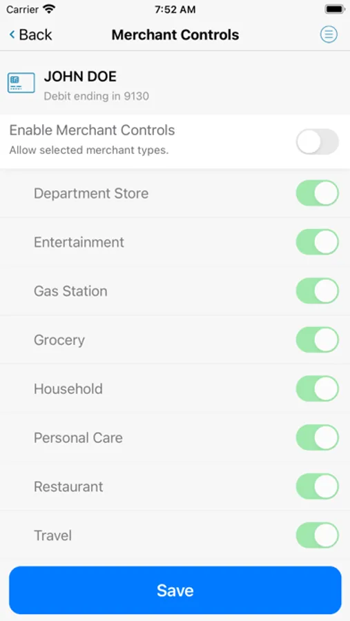 Set spending limits to decline transactions above your thresholds. Monitor activity by category such as gas stations and restaurants, and by type: in-store purchases, e-commerce transactions and ATM transactions.