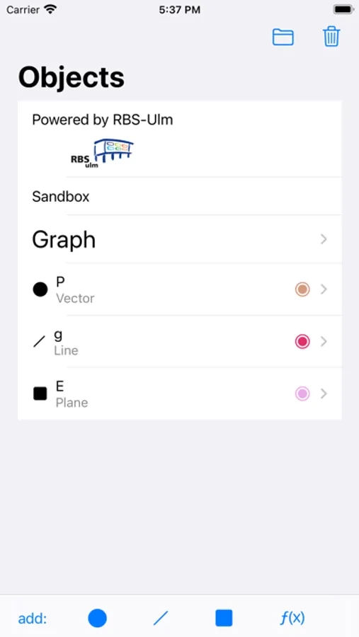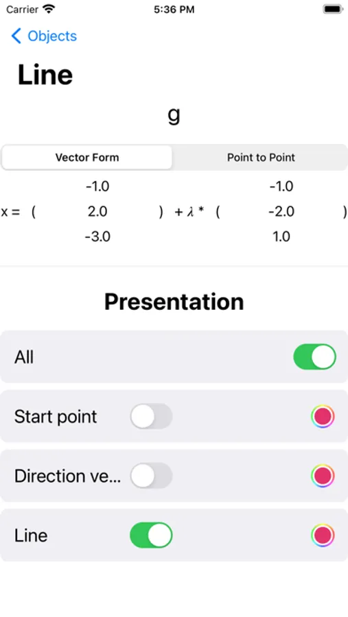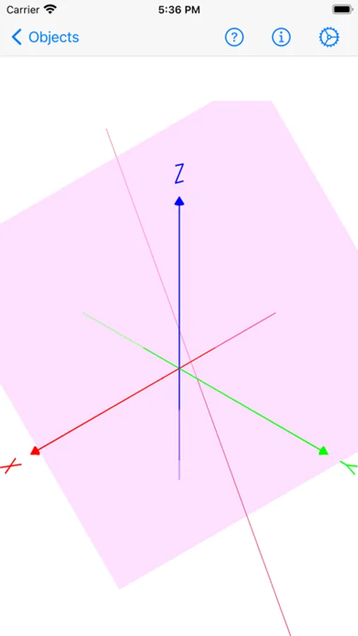Vector Gem can display the starting point, the direction vectors and the normalized vector for each plane and calculate the intersection points with the axes. For lines it can display the starting point and the direction vector and calculate the points of intersection with the coordinate planes.