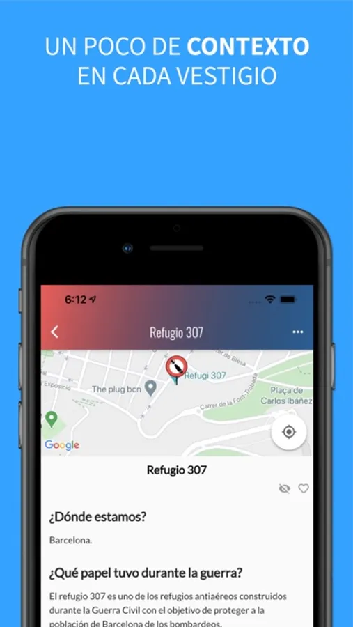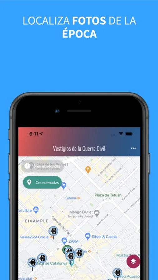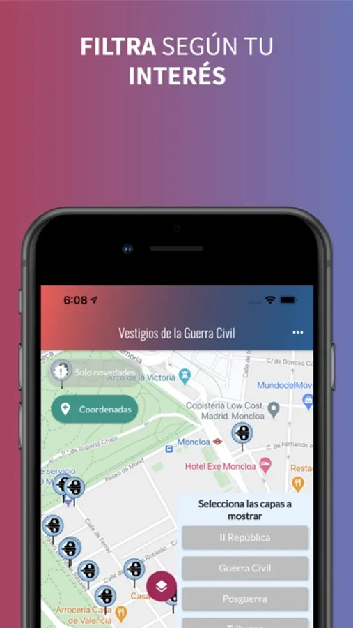 Aplicación colaborativa para crear un catálogo de posiciones geolocalizadas de aquellos vestigios de la guerra civil española todavía visibles. Desde construcciones como fortines, a heridas en las fachadas y el terreno producto de los enfrentamientos. También hay un catálogo de fotografías de la guerra civil española geolocalizadas para comparar con el momento actual. También hay capas de callejero, tributos y vestigios de la II república y del franquismo.