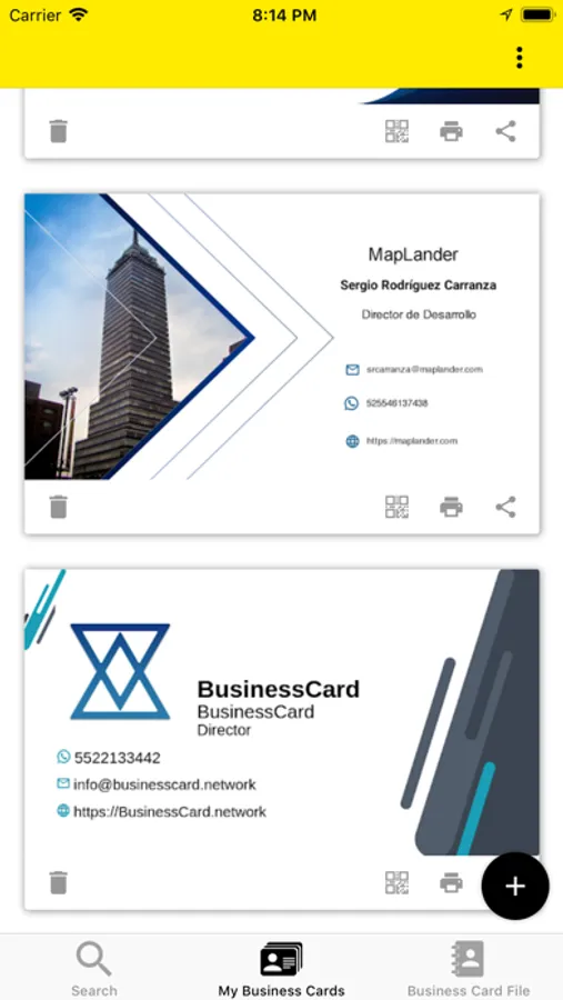Actualice su tarjeta de presentación confiable con destreza digital. Imprima fácilmente con metadatos y la capacidad de compartirlos a través de su teléfono móvil con cualquier persona, en cualquier momento y lugar. Cree nuevos diseños de tarjetas de presentación para cualquier número de empresas y diferentes conciertos, al instante y en la palma de su mano. Imprímelos si quieres, guárdalos en tu nuevo archivo de tarjeta en tu teléfono y tenlos listos para compartir en WhatsApp y todas tus redes sociales con un toque de tu dedo. Ahorre dinero y árboles y ponga su negocio en el mapa de la primera red global verdaderamente empresarial con BusinessCard.