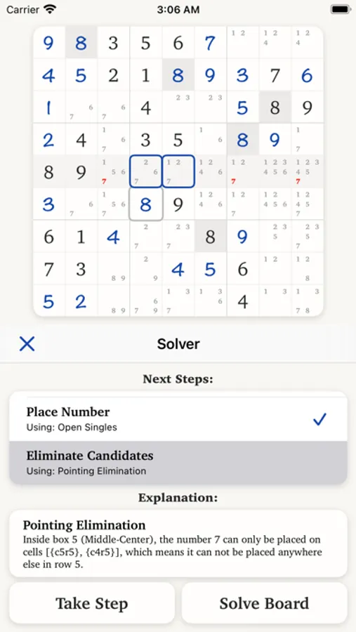 * Step-by-Step Solver: Got stuck with a puzzle? Pro:Sudoku comes with a solver to help you move ahead. The solver will also explain why that step can be taken, to help you understand advanced solving techniques. (Note that "diabolical"-level techniques are not yet supported.)