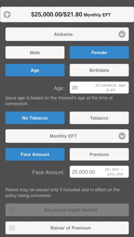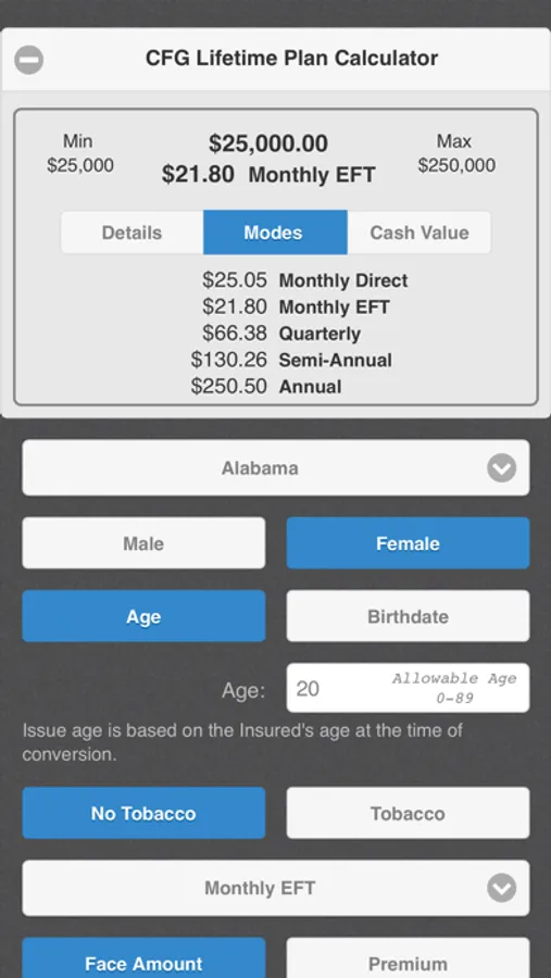 Provides rates for Lifetime Plan product for independent agents of Columbian Financial Group.