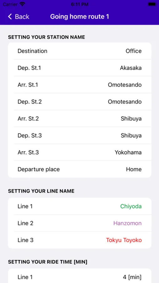2-3) Tap "Depart Sta.1" and enter your 1st departure station name. If necessary, set up "Depart Sta.2" and "Depart Sta.3" in the same way.