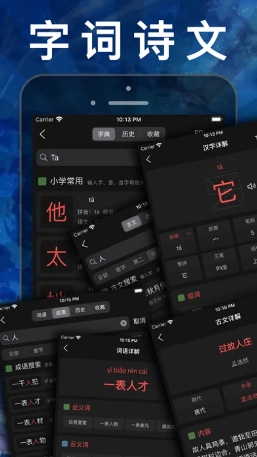 3、汉语字典、拼音、笔画、边旁部首搜索功能;