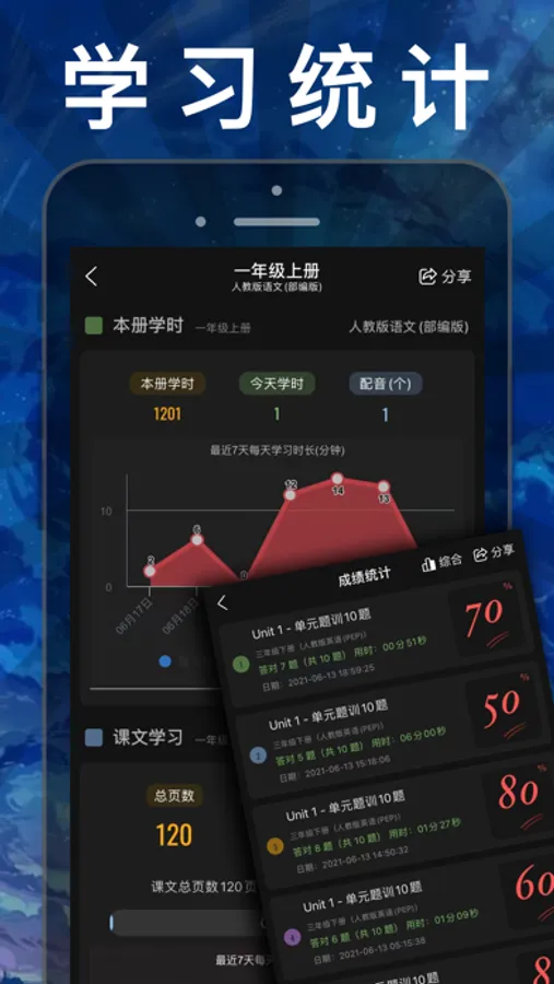 学习成就:图表统计学习情况,孩子的学习情况、训练成果五目了然。