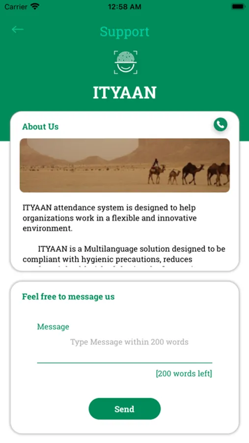 ITYAAN is a Multilanguage solution designed to be compliant with hygienic precautions, reduces employee’s health risk of sharing the fingerprint sensors for attendance, minimizes the risk of workplaces becoming centers of diseases’ transmission and ensures appropriate plans in place in case of employees are on vacation, quarantined or infected.