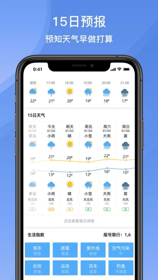 多维指标:气压、能见度、湿度等多维指标,让您更加了解天气情况。
