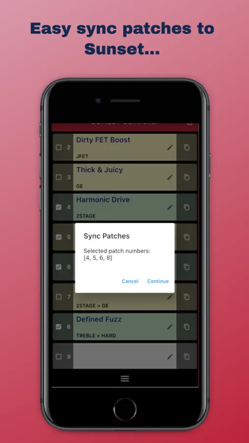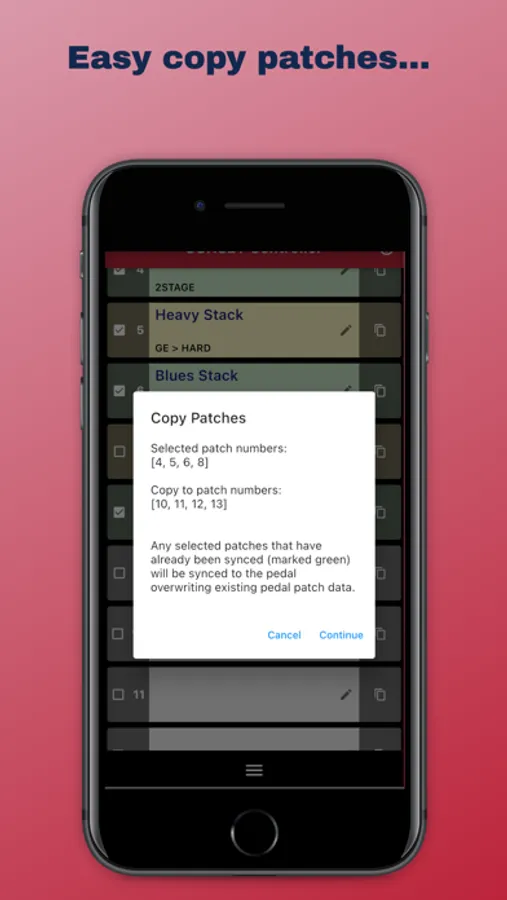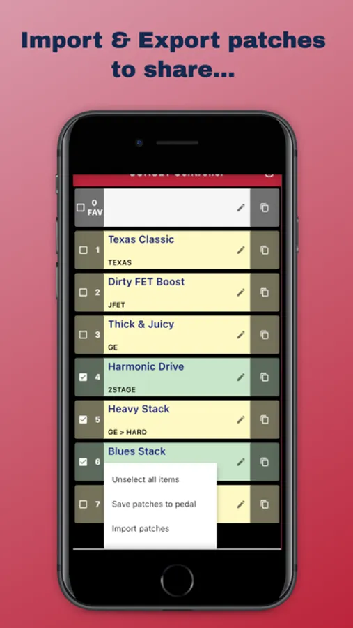Import and Export selected patches to your device, iCloud, Airdrop, messenger etc. Good for backing up, having setlists or sharing with others.