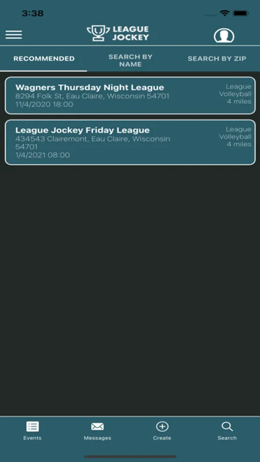 Search for events with a sport type in a specified area. IE Volleyball in the 54703 area.