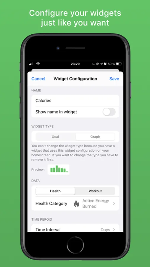 With the graph widget you can get a more detailed view on your progress. It shows you a graph of how well you did the last hours or days. You could use it to track how much you rode your bike every day for the last week. This type is available for the medium widget size.