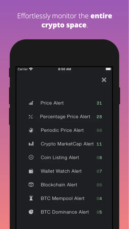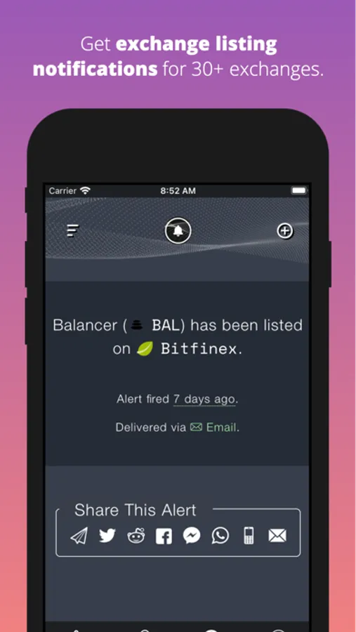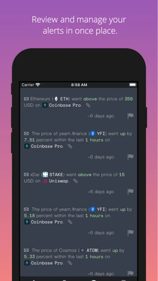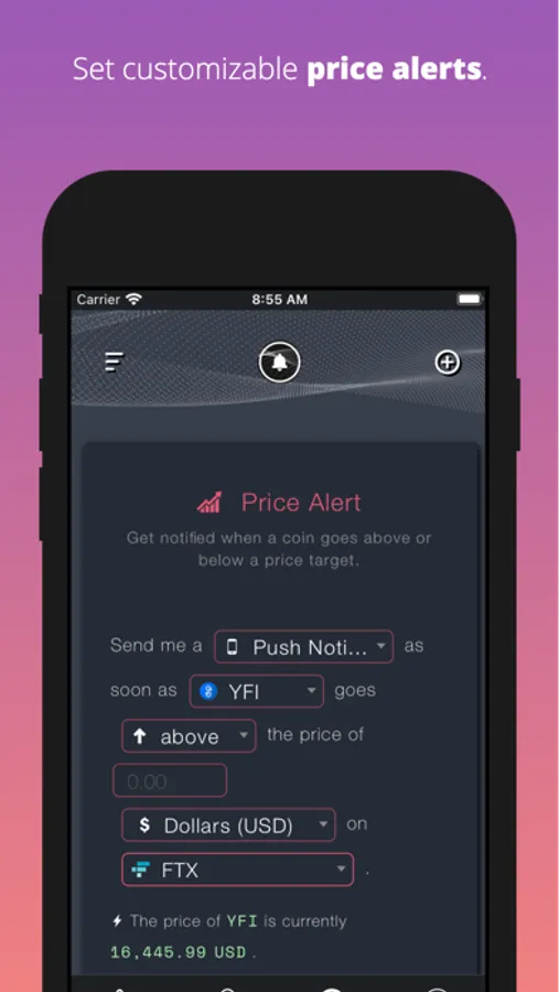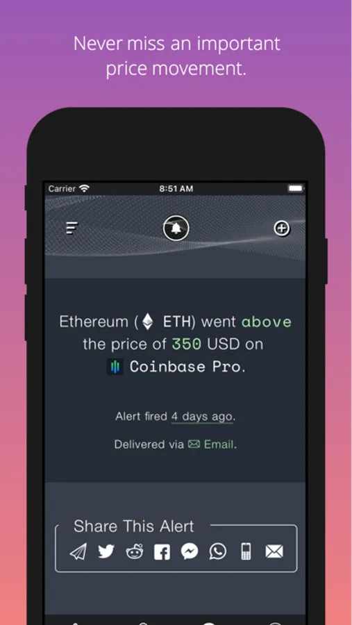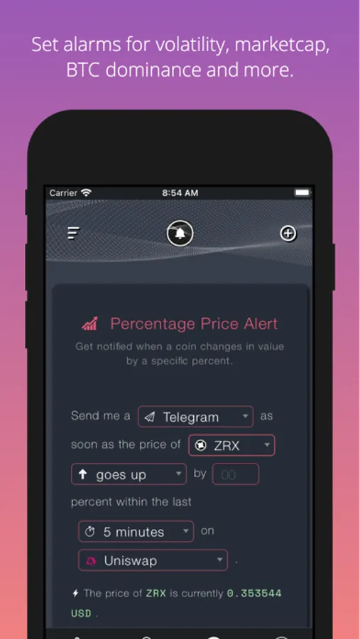 * Price Alerts - Realtime, customizable price alerts for over 20,000 different cryptocurrencies across 30+ top crypto exchanges, including Coinbase Pro, Binance, Uniswap, PancakeSwap, BitMEX, FTX, Bittrex, Bitstamp, Bithumb, Kraken, Bitfinex and dozens more. We also offer price & volatility alerts for over 10,000 Stocks & ETFs.