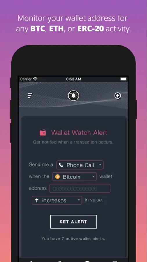 Set customizable alerts on important metrics within the Bitcoin, DeFi and wider Crypto ecosystem. In addition to price alerts, we detect exchanges listings, volume spikes, BTC & ETH wallet transactions, whale alerts, the BTC Mempool size, ETH gas prices, and other on-chain metrics. You can also monitor traditional financial markets with our stock market alerts.