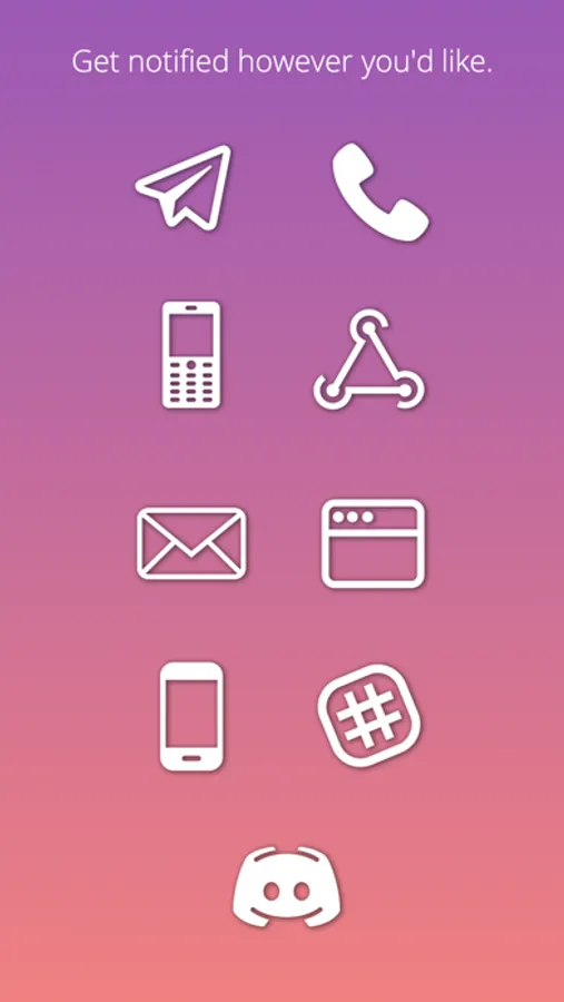 We support push notifications, email, sms (text messages), automated phone calls, Slack, Telegram, Discord, webhook events, and browser notifications.