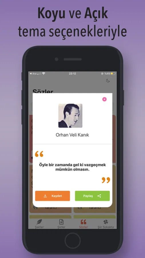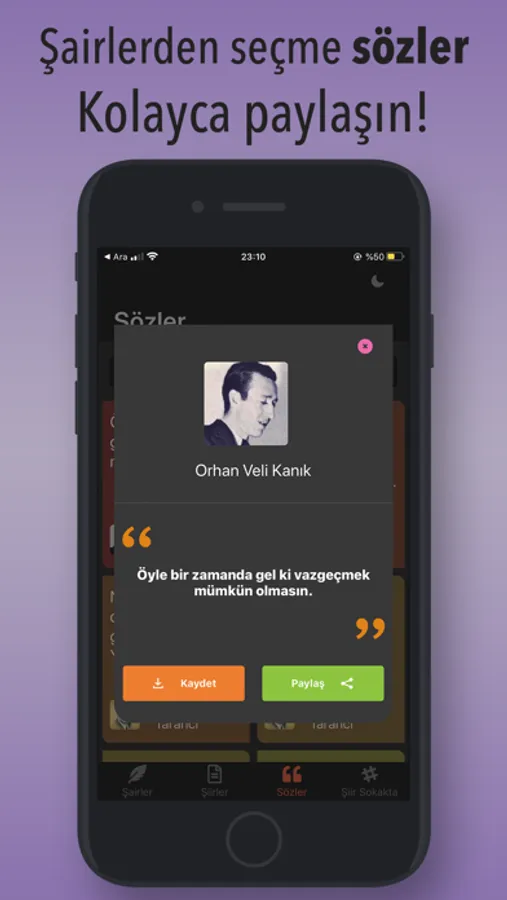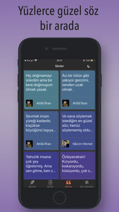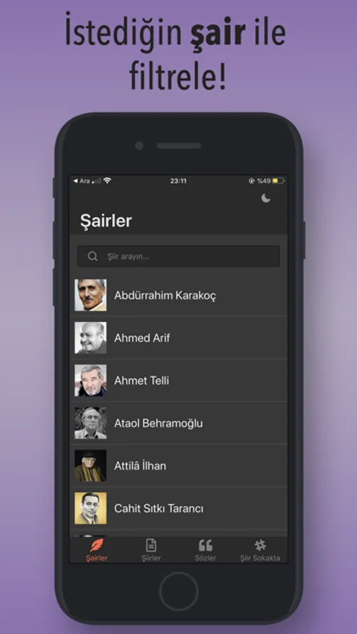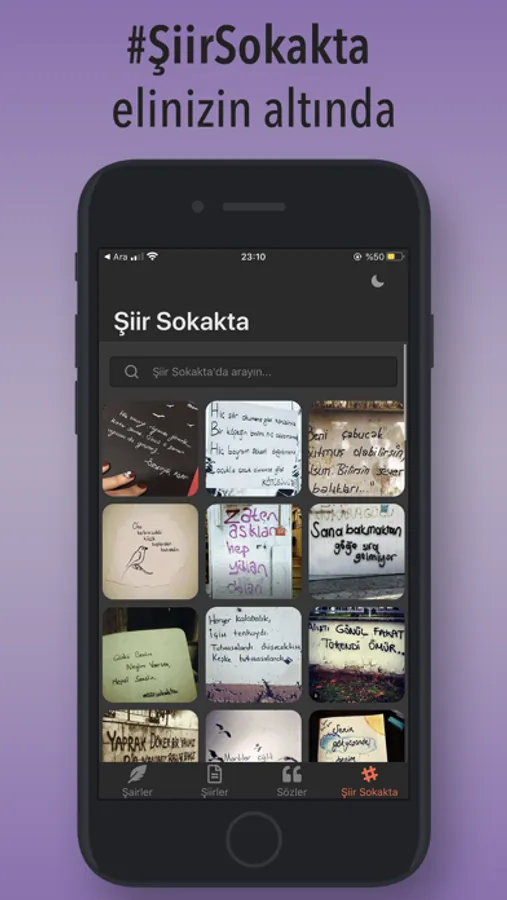 Bu uygulamada, şairleri listeleyip sözlerini ve şiirlerini okuyabilir ayrıca şiir sokakta akımından paylaşımları listeleyebilirsiniz. Üstelik içeriklerimiz her geçen gün genişlemeye de devam ediyor.