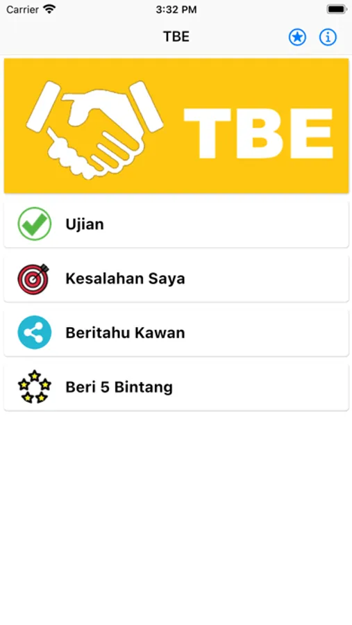 This app contains 4 sets of TBE questions in Malay to help you practice and pass the exam.