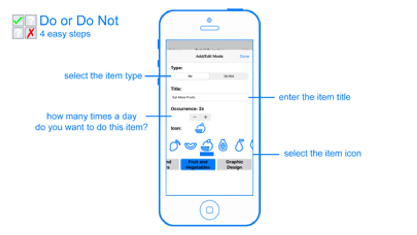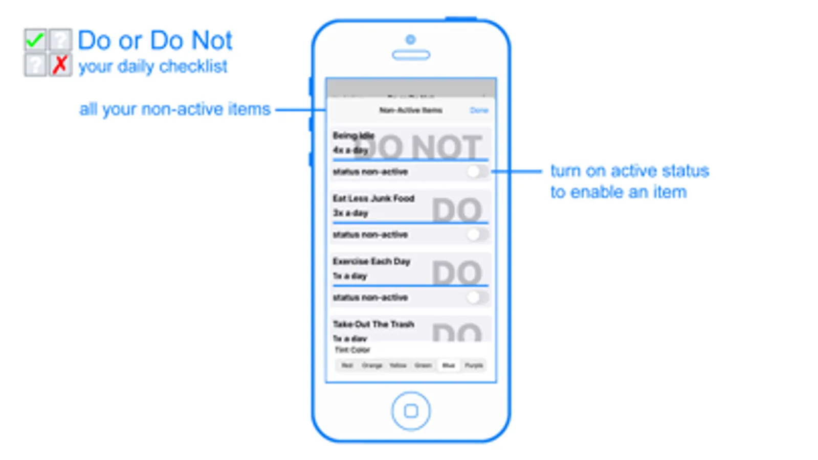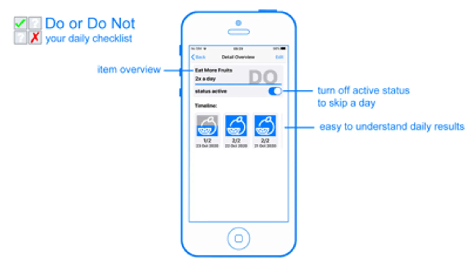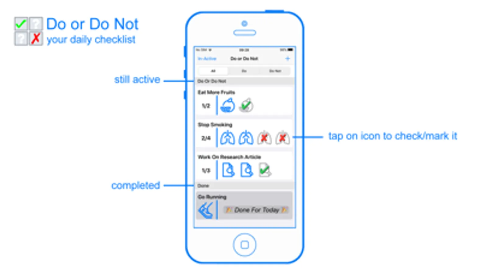 Track your day to day activities with Do or Do Not. Once you start using this application, you'll not want to go back to a time without having it. Each activity or habit can be set with an icon to better identify and distinguish itself from other activities.