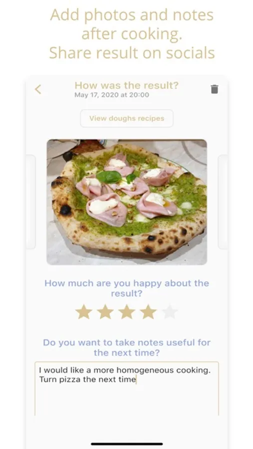 PizzAssistant will help you to keep track of your improvements day by day thanks the possibility to upload photos of your creations and save notes.