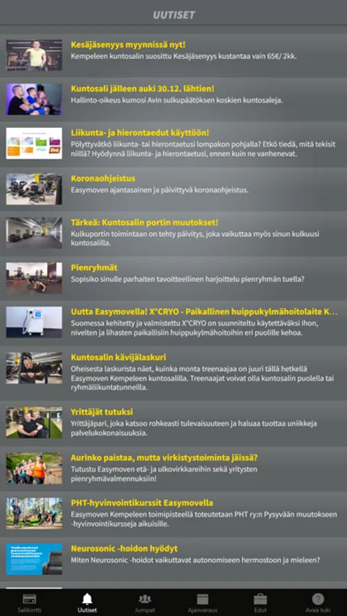 Olit sitten jo Easymoven jäsen tai vasta sellaiseksi haluava, mobiilisovelluksemme on käyttöliittymäsi meidän palveluihimme. Voit sen avulla aloittaa kuntoilut meillä, käyttää mobiilisalikorttia, varata ja kirjautua ryhmäliikuntatunneille, viestiä asiakaspalvelumme kanssa ja paljon muuta!