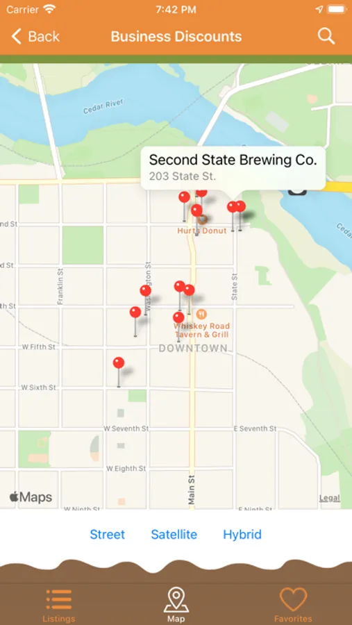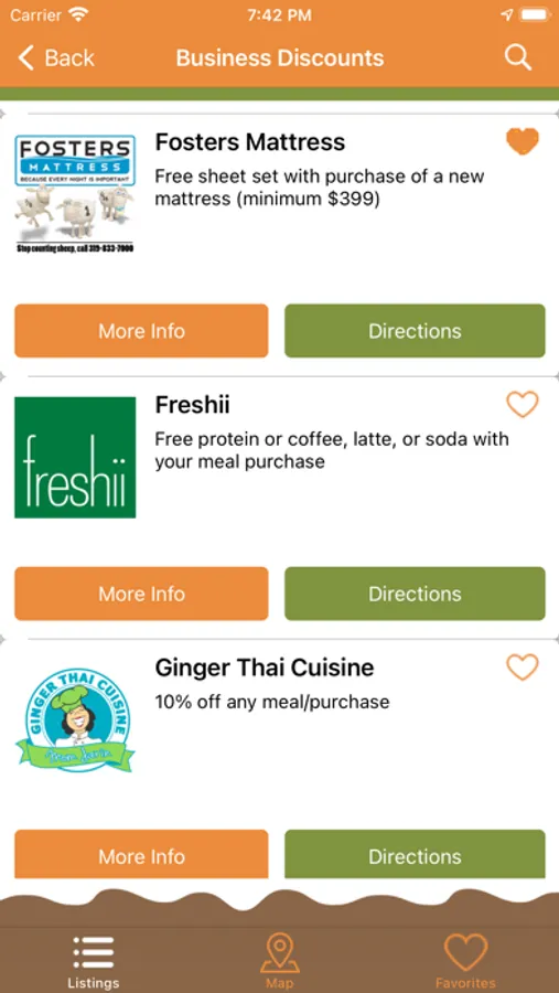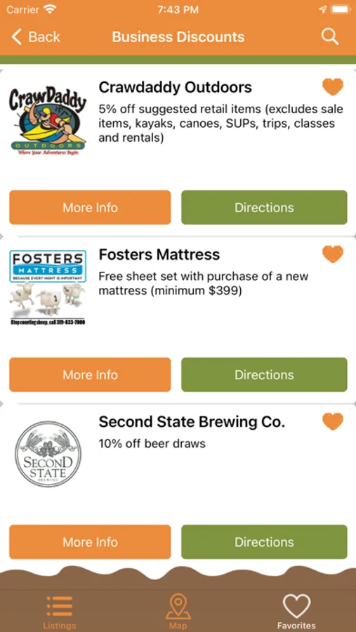 - Each listing provides business information and links to your map program to provide directions to the location.