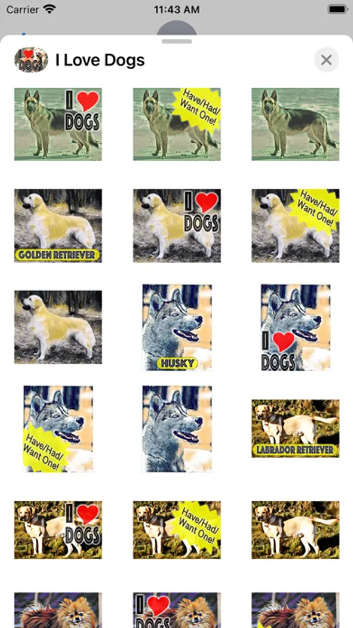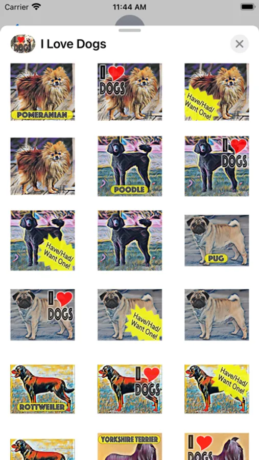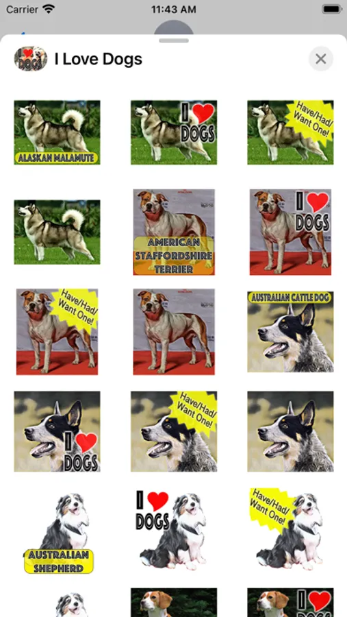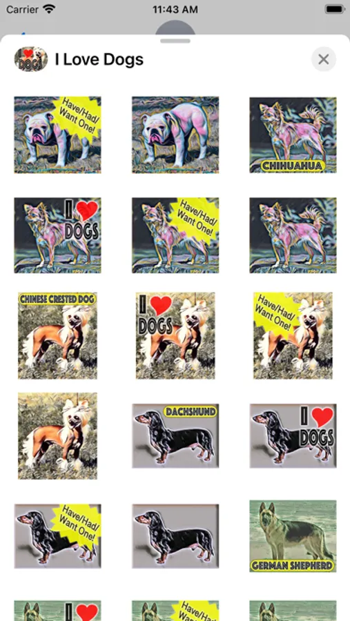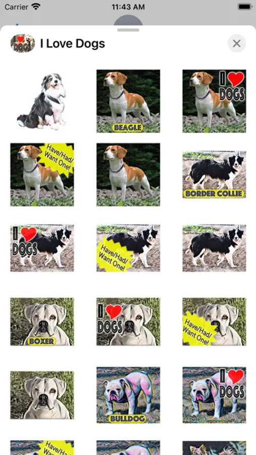 Each sticker comes in 4 flavors: "I Love Dogs", "Have/Had/Want One", a sticker with the dog name, and a sticker of just the image of the dog.