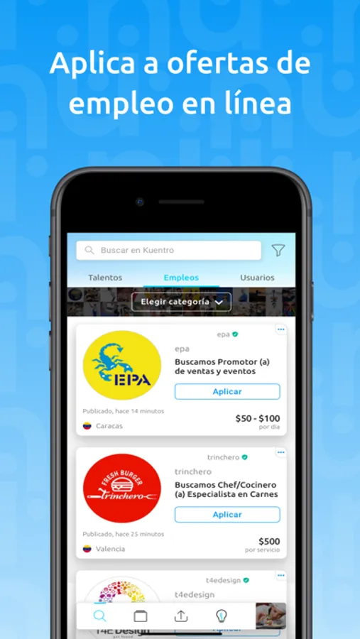 Kuentro es la primera aplicación de trabajo estilo red social diseñada para todos, comparte tus habilidades y encuentra el trabajo perfecto para ti. Incluso puedes contratar a otros usuarios, seguir y conectar con empresas y otros talentos. Kuentro te ofrece todas las herramientas para que busques, encuentres y evalúes según tu propio criterio a la persona idónea