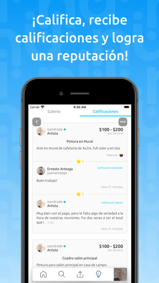 Calificaciones y Comentarios: Historial de contrataciones con sus calificaciones y comentarios en los perfiles de usuarios y talentos. Los empleadores califican al talento y viceversa
