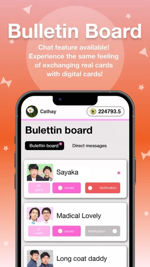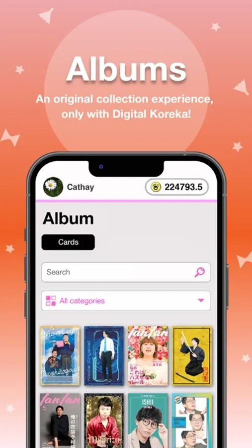 The in-app Bulletin Board allows users to communicate with other users, share digital Koreka on SNS, interact with other fans, exchange via DM and negotiate directly with each other. You can also browse albums among friends.