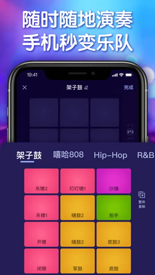 打击垫 是一款电子音乐制作软件。用户可以创建自己的音板,个性化组合音色,定义音色播放方式。用户可以基于自定义音板进行个性化演奏,演绎自己的节拍律动,同时可以录制音乐,分享给自己的好友。软件还内置了样例,支持音频多种播放方式,重放演奏过程,同时还可以跟随练习,更快上手。
