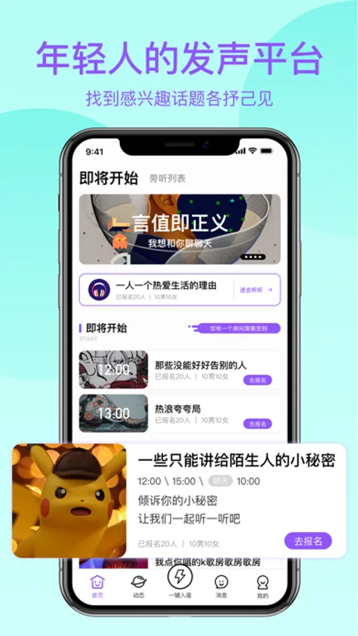 ·旁听频道:不想说话的时候,来听听别人聊天,多个类型的话题可供挑选,选择感兴趣的话题旁听。