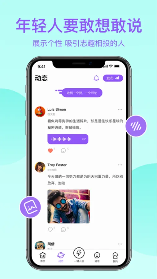 ·动态广场:年轻人要敢想敢说,展示你的个性,吸引志趣相投的人关注。用户发布动态,分享心情、分享新鲜事。同时可以看到其他用户在广场实时更新的动态。