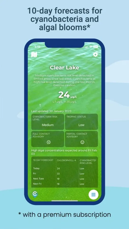 Make informed decisions and stay clear of potentially toxic cyanobacteria blooms with advisories for full and partial contact water sports. Use while fishing, boating, skiing and doing water sports.