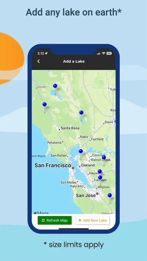 Search for lakes near you or add a new one by dropping a pin on the map. Easily add or remove lakes from your list.