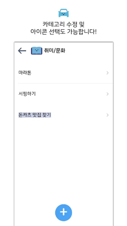 카테고리 이름 및 아이콘은 해당 카테고리 안에서 터치 시, 수정 가능합니다.