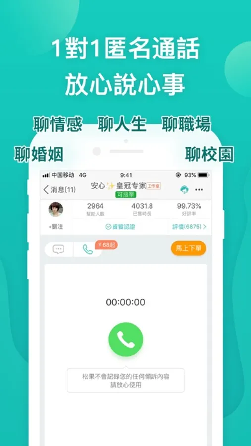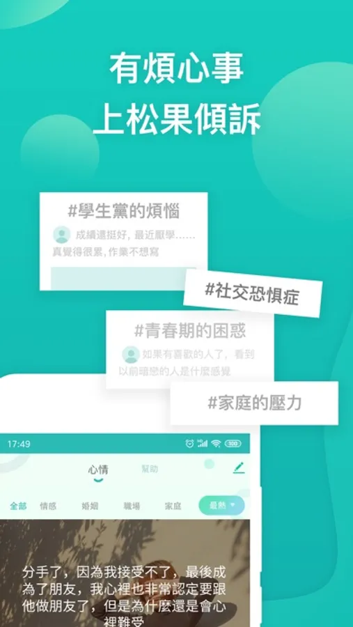Songguo Talk是一個私人諮詢平台,為全球超過86個國家/地區提供服務。 Letstalk提供有關關係,約會,婚姻,家庭,心理健康,日常生活,育兒,教育,工作場所,學校,健康等問題的諮詢服務。作為註冊關係顧問的100,000多名精英聽眾, 婚姻和家庭諮詢師,心理治療師,職業規劃師,催眠師,律師,會計師以及各行各業的人(海歸,企業家,家庭主婦,教育工作者,LGBTQ社區以及100多個行業的高級工人),總是有一個傾聽者 誰可以為您提供最適合您需求的幫助。