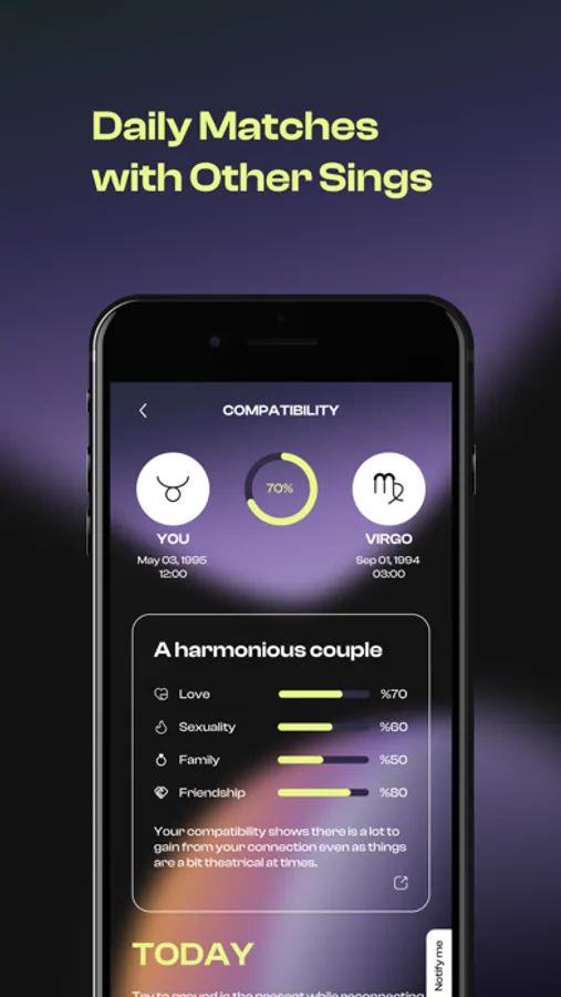 Our Tarot feature offers you insight into your future and guidance on the path ahead. With our compatibility feature, you can find your perfect match by comparing your astrological charts.