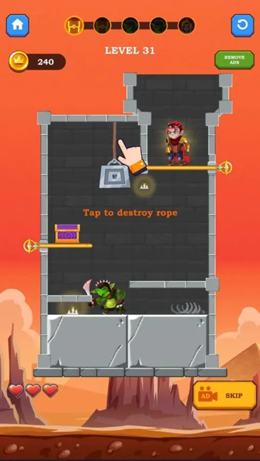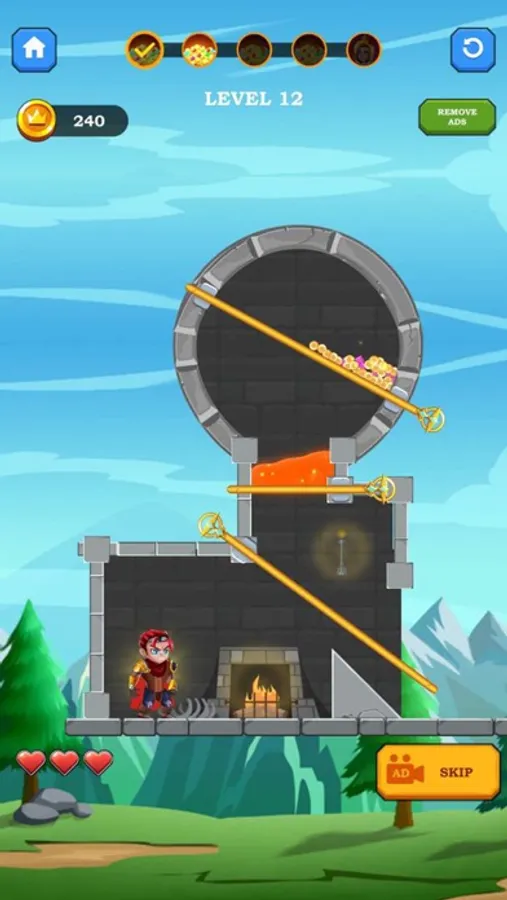 The hero began his journey for treasure and to save the princess, but the puzzles in front of the hunter trapped him. What you need to do is to pull the pins in the right order, so that the hero can take the hidden treasure and save the princess away from the dragons, wolves and monsters safely.
