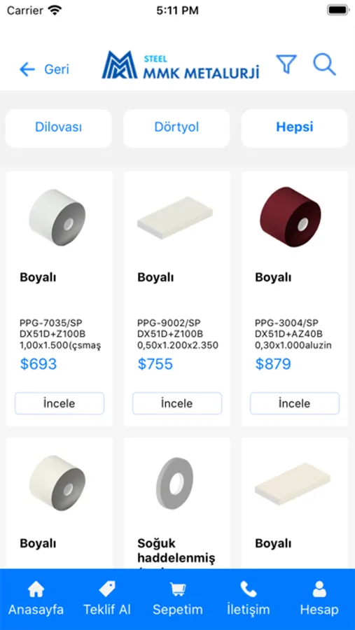 Türkiye'nin önde gelen sanayi kuruluşları arasında olan MMK Metalurji'nin ürünlerinden daha hızlı ve daha kolay bir şekilde stok kontrolü yapabilir, uygulama üzerinden sipariş verebilirsiniz.