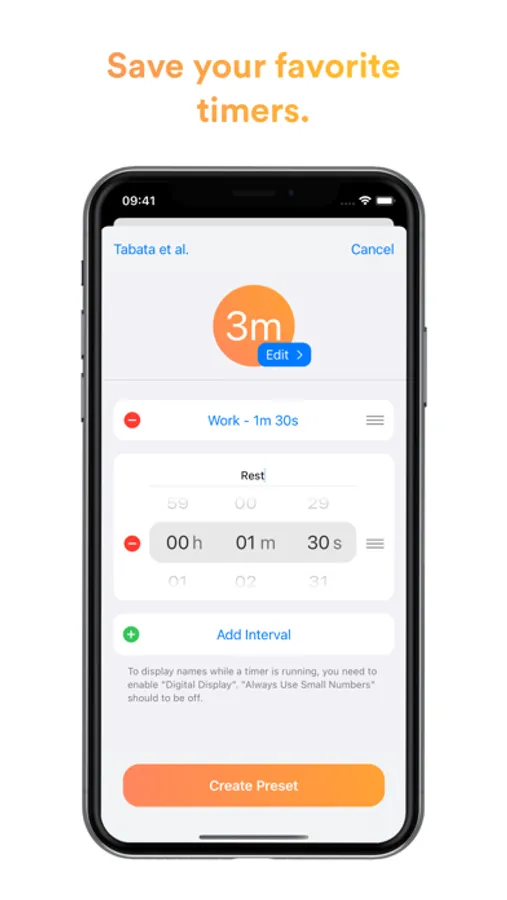 You can save your favorite timers as presets which are nicely presented in a scrollable list. Presets can be edited, reordered, deleted and started with just one tap.