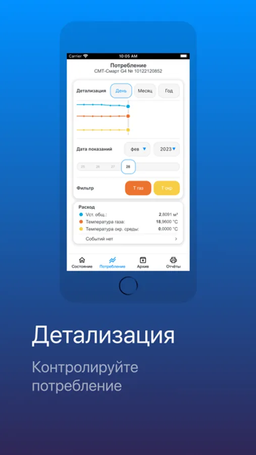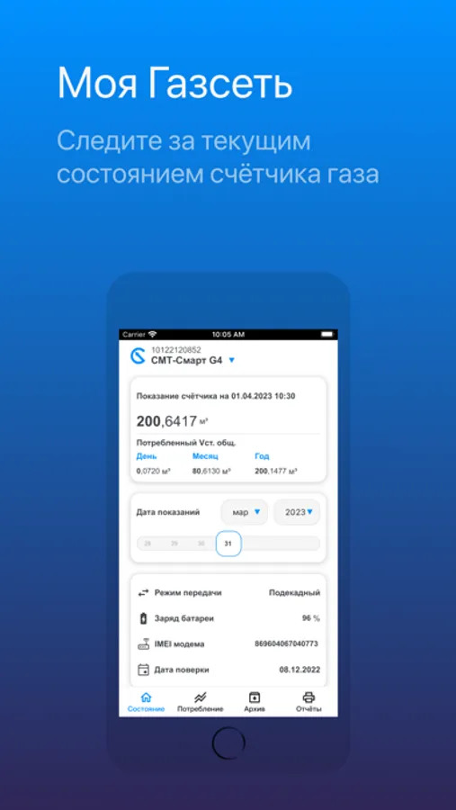 Мобильное приложение "Моя Газсеть" предоставляет пользователю широкий спектр возможностей по анализу газопотребления, контролю состояния счетчиков газа СМТ-Смарт и СМТ-Комплекс, имея при этом всего лишь смартфон .