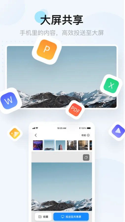 共享屏,大屏移动共享专家,专注于小屏与大屏之间的内容共享与互动。你可以用共享屏来储存要在大屏共享的文件内容,并能便捷地将收藏的内容投至大屏。还支持多人接入同一大屏,即时对大屏共享中的内容进行互动与协作。