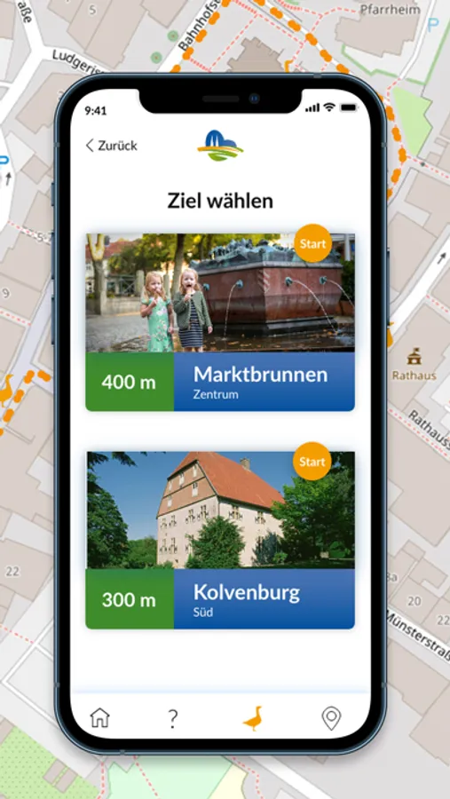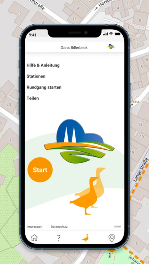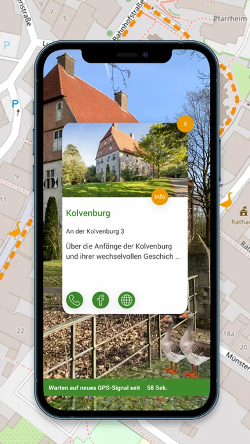 Sollten Sie die Gänsenavigation nicht nutzen können, stehen Ihnen aber die Informationen zu den Stationen und die 360°-Aufnahmen zur Verfügung. Sie können den Rundgang also dennoch "auf eigene Faust" unternehmen. Wir empfehlen Ihnen dann, als zusätzliche Info für den Routenverlauf den Flyer zur App herunterzuladen: www.billerbeck-muensterland.de