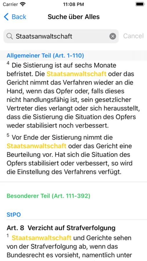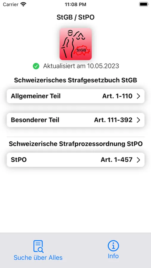 Die App ist aufgeteilt in Strafgesetzbuch Allgemeiner und Besonderer Teil sowie die Strafprozessordnung. Sie ist übersichtlich und teilweise gekürzt dargestellt. Via Link können die Originaltexte aufgerufen werden.